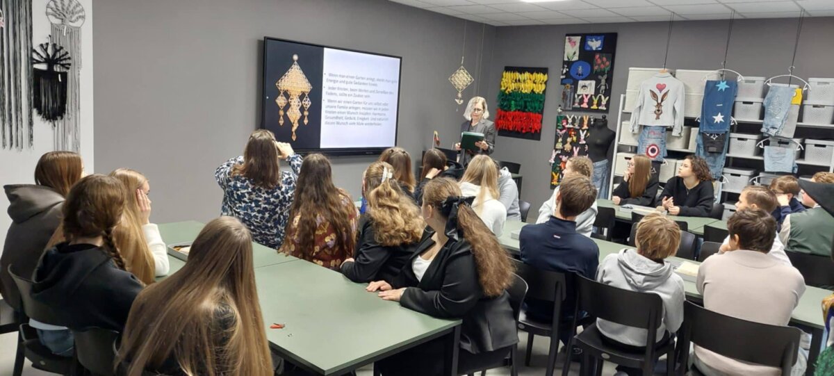 susikaupimo reikalaujanti veikla – sodų rišimo edukacija, kurią vokiečių kalba vedė mokytoja